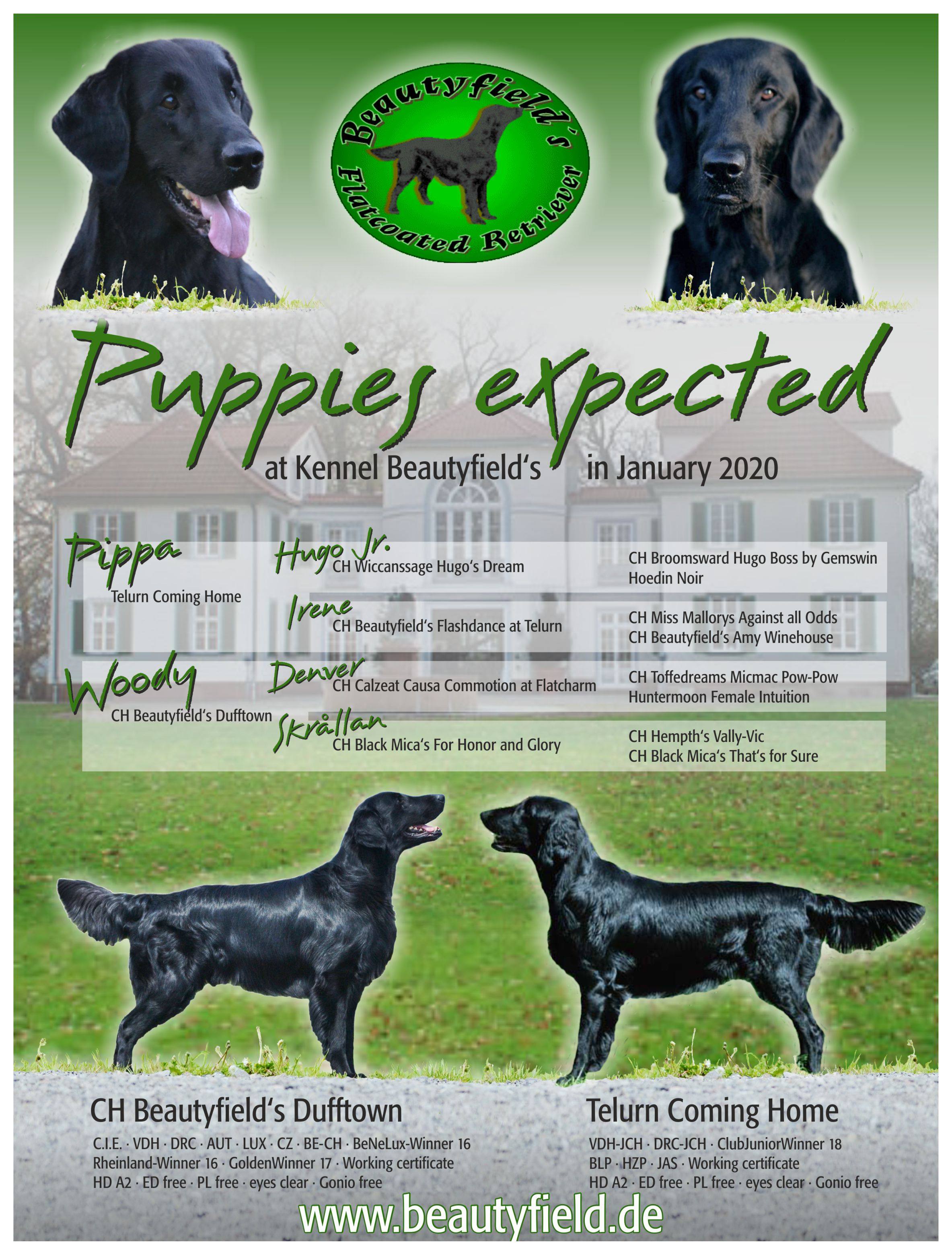 Am 05. Januar 2020 bekamen Woody und Pippa - 10 Welpen. CIE CH Beautyfield's Dufftown (GBCH Clazeat Causa Commotion at Flatcharm X CH Black Mica's for honor & glory) und GerJunCH CJS2018 Telurn Coming Home (Wiccinssage Hugo's Dream JW X GBCH Beautyfield's Flashdance at Telurn JW)